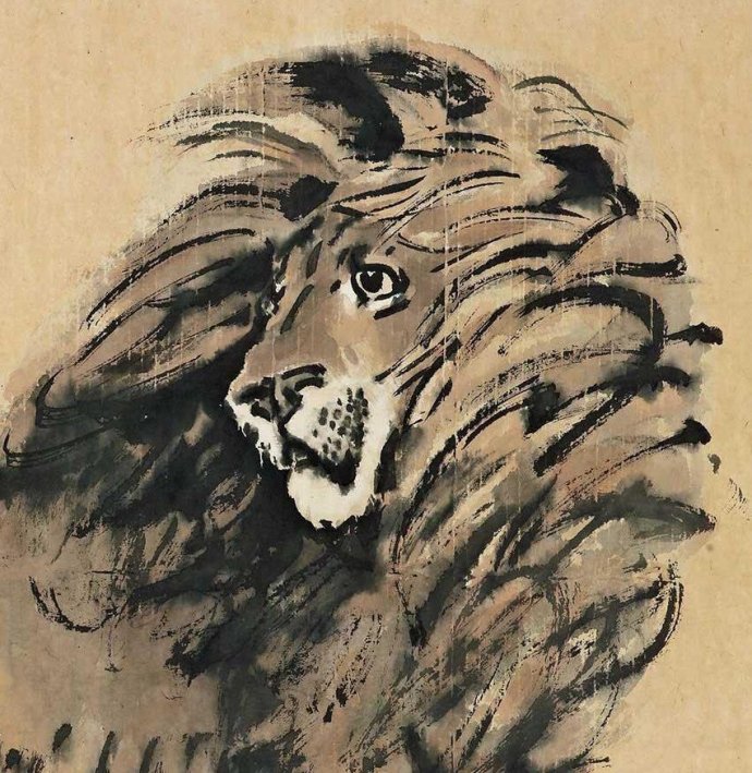 《雄狮》是徐悲鸿1932年动物题材的代表性巨制,画幅逾十平尺,绘一头健硕雄狮踞坐于嶙峋的山石上,回首目眺远方,逆风拂动的长鬣用大笔纵横披捺,尽现其雄视天下的王者之概,气势撼人。
