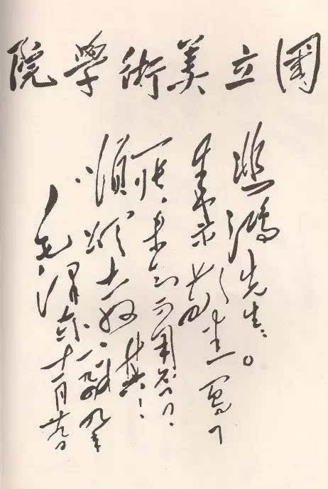 毛泽东为国立美术学院题写院名 1949年 上面是毛泽东应徐悲鸿之邀,为中央美院(当时称“国立美术学院”)题写的院名,并同时附有一封简短信件。