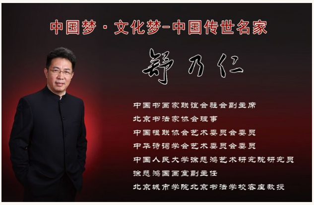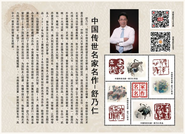 舒乃仁,现任中国书画家联谊会驻会副主席、北京书法家协会理事、中国楹联协会艺术委员会委员、中国人民大学徐悲鸿艺术研究院研究员、徐悲鸿国画室副主任、北京城市学院北京书法学校客座教授。致力于中国传统文化的弘扬与研究,潜心于诗书画印的创作,为当代诗人书法家、发明家。其作品以诗入书、以书入画,追求内容与形式的完美统一,被国内外多家博物馆、艺术馆、展览馆收藏;曾荣获北京国际书法双年展突出贡献奖,首届书画春晚"十大书法家"称号,曾应邀为中国历史名胜创作诗词书法作品,包括黄山、长白山、武夷山、青城山、山西省民居乔家大院等,也曾作为国礼赠送国际友人包括波黑总统乔维奇、丹麦亲王亨利克、澳大利亚议会及悉尼市长、韩国环保部以及台湾连战、宋楚瑜、江丙坤等名人。曾为世界文化名人帕瓦罗蒂、我国体育名人穆祥雄、郑凤荣、许海峰等创作主题作品。2012年为第30届奥运会38名中国奥运冠军创作嵌名诗书法作品,歌颂奥运精英、弘扬爱国精神,《北京日报》每日与奥运新闻同步刊登,连载16天,奥运博物馆特举办专题展览并收藏相关作品,中国奥委会联合中国邮政、中国集邮总公司据此发行《奥运金牌新闻明信片》并举行了全民抽奖活动,中央电视台等多家媒体做了相关报道。舒乃仁先生曾出访20多个国家进行书画交流活动,为国际友人授课,传播中国文化。他曾将书画艺术与科技发明结合,发明了"多功能毛笔握笔器"、"书画夜显装置"荣获两项国家专利,其中之一荣获中国爱迪生发明奖。
