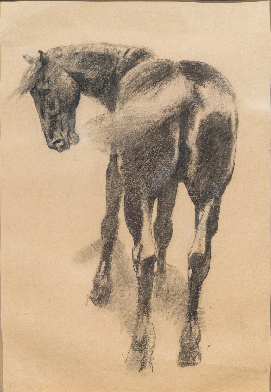 还有,比如看父亲画的马,由于透视不同、所处空间位置的不同,马的四条腿的长短是不一样的,四个蹄子也不是一样大小的,那么如果在这上面出现一点点问题,你就可以断定不是他的作品。特别是他画的很多大角度透视的,比如马的臀部朝着你或者头朝着你,这种呈正面跑过来的马,马的形态和生活中我们看到的的形态是完全不一样的。就像一头狮子朝着摄影机走过来,前面一个大脑袋,后面一个小身子、小尾巴,真实的话就是那种效果。现实中,画家如果那样画出来肯定不好看,头就不能画那么大,身子也不能画那么小,但要看着舒服又符合透视,符合科学,一般只有大师才能碰这种角度。