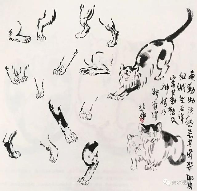徐悲鸿课徒画稿中记述了对猫形体的研究(图2)。他详细分解了猫头、猫足、猫身的画法。有关猫足的描绘,被徐悲鸿分解为站立时、行走时、抬足放足时、跃起发力时,他在画稿旁注释道:“画动物需熟悉其骨架肌肉组织,然后详审其动态及神情,乃能有得。”〔14〕对猫眼部的描绘,也被细分为闭眼打哈欠、眯眼憨笑、怒目圆睁、侧目斜视、圆形瞳孔、扁圆形瞳孔、线形瞳孔。徐悲鸿爱用藤黄染金眼,花青染银眼〔15〕,难怪王少陵赞其“绘猫更能手,妙处在神眸”〔16〕。