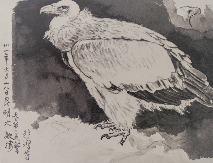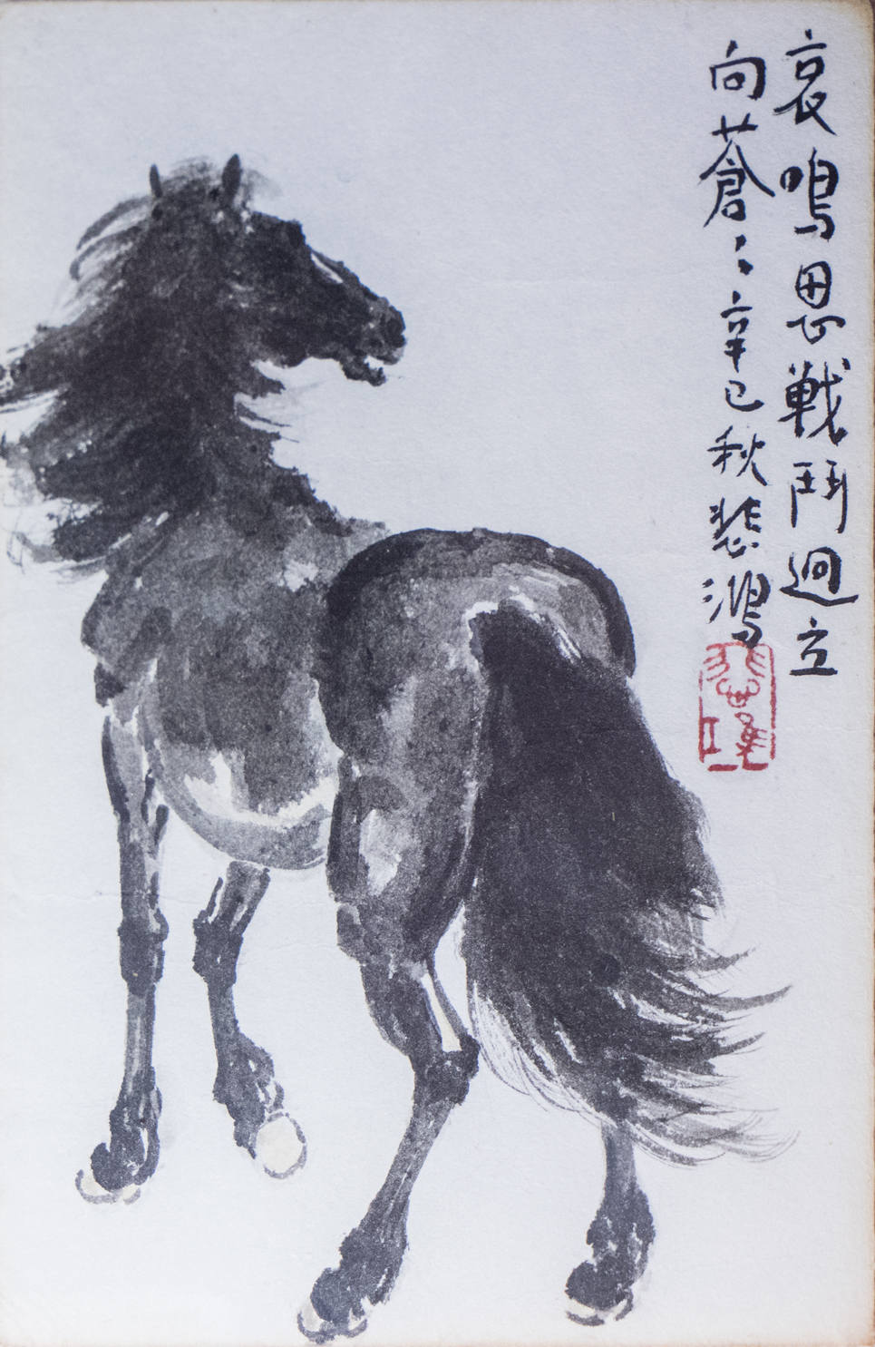 纸本水墨,15.3X10.1cm,1941年,款识:哀鸣思战斗,迥立向苍苍。辛巳秋,悲鸿。